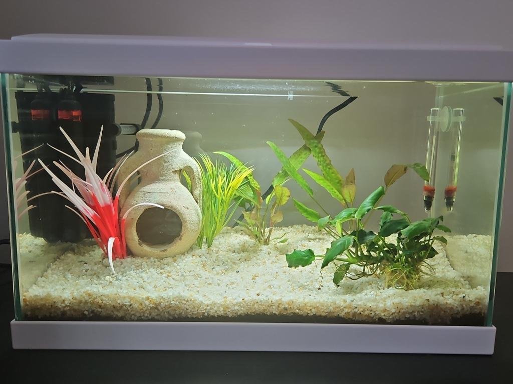 CF40 + chauffage 10W Temp : 27c Flore : Anubias + Cryptocoryde Faune : 1 Betta Crowntail Bleu/Blanc.Rouge |