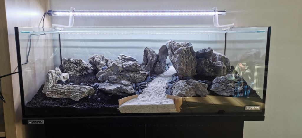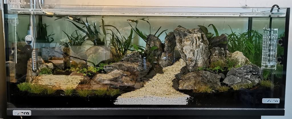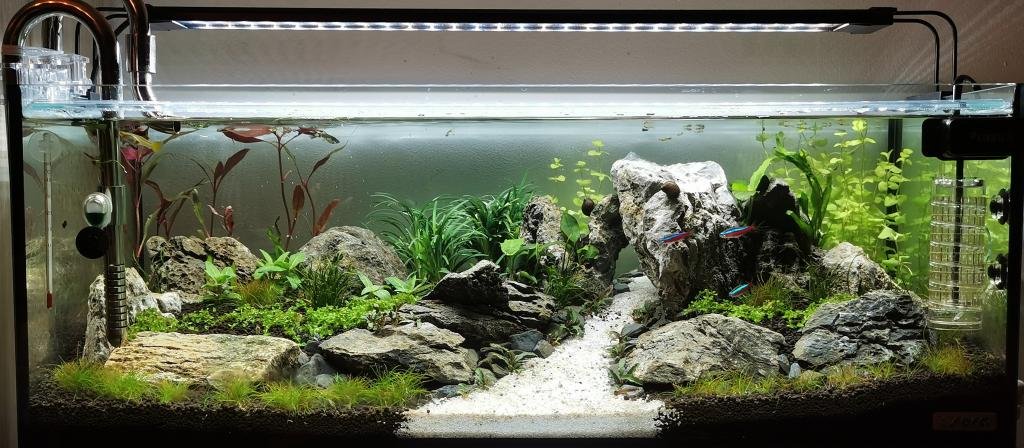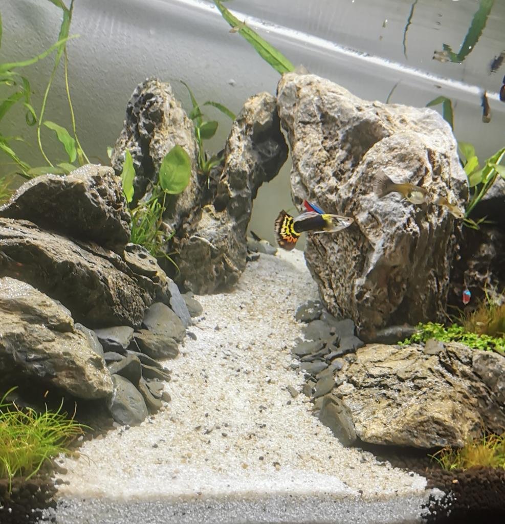 J'avais commencé avec un nano Aquael de 30L et une population de crevettes. Pas de problème durant la première année. Mais un jour, un de mes amis est arrivé chez moi avec des guppys (Surprise). J'étais content des 6 guppys qu'il m'a offerts... Mais ! Les problèmes ont commencé... Bouffon et pollueur. Mon 30L n'a pas supporté cet arrivage. Logique. De plus, l'emplacement de ce nano sur un KALLAX Ikea ne me permettait pas d'y mettre les mains facilement et donc d'être méticuleux lors des entretiens quotidiens qui étaient suffisants pour les crevettes. Du coup, explosion d'algues, couche d'excréments conséquente, etc... J'avais pitié de ces magnifiques poissons, j'ai donc décidé de leur rendre une vie plus heureuse. J'ai donc lancé un aquarium SERA de 96L à un prix démocratique dédié aux guppys et 3 néons rescapés du bac d'un ami qui a arrêté pour des raisons de déménagement. Beaucoup plus facile pour les entretiens vu sa hauteur et son ouverture, ainsi que son meuble pour la technique. Je me suis fait plaisir en m'inspirant de vidéos et de photos d'aquascaping pour réaliser un scape plus sympathique que dans le 30L. j'ai utiliser de la SEIRYU STONE comme base. J'y ai ajouté une filtration externe + chauffage Oase, un éclairage Amtra avec effet lever et coucher de soleil RGBW, ainsi que l'ajout de CO2 JBL proflora. Depuis, mes guppys se portent bien ! Plus de nage et meilleure qualité d'environnement font que des petits alevins apparaissent ! |