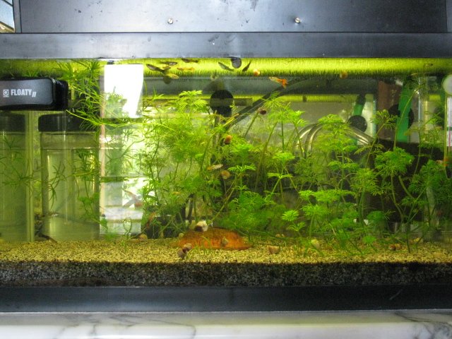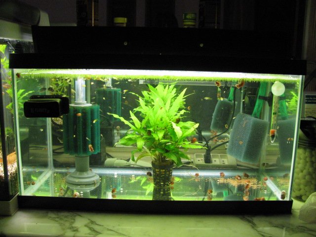 Bac de 30L dédié au alevins de guppys issus de mon propre élevage. J'ai mis du sol nutritif et du sable,pour me rapprocher d'une maintenance classique!!! Le filtre est un eden 501 remplit uniquement avec des bio billes micromec(JBL),la crépine est un morceau de mousse fine qui évite d'aspirer les alevins et fait office de filtration mécanque. c'est un aquarium d'occasion,trouvé dans un troc pour 20€ avec l'éclairage,une pompe à air,un chauffage,un filtre sous sable en super état... |