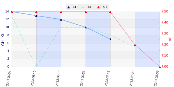 | Température | pH | Dureté_carbonatée(KH) | Dureté_totale(GH) | Nitrates(NO3) |