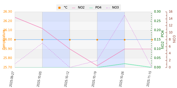 | 26 °C | 8,3 | 14 | 13 | 0,3 mg/l | 1 mg/l | 2 mg/l | 662 µS/cm |