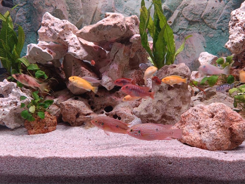 Aquarium volontairement surpeuplé pour éviter les gros conflits car ces poissons sont très territoriaux. Beaucoup de pierres calcaire pour créer beaucoup de cachettes ont permis que tout le monde trouve sa place. Plusieurs naissances ont eu lieu. principalement les labidos et les flavus. |