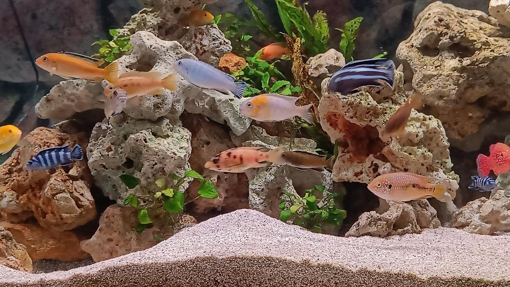 Aquarium Biotope Malawi de 360 litres peuplé principalement de Mbunas. Mis en eau septembre 2022 et qui a évolué depuis principalement en terme de population.