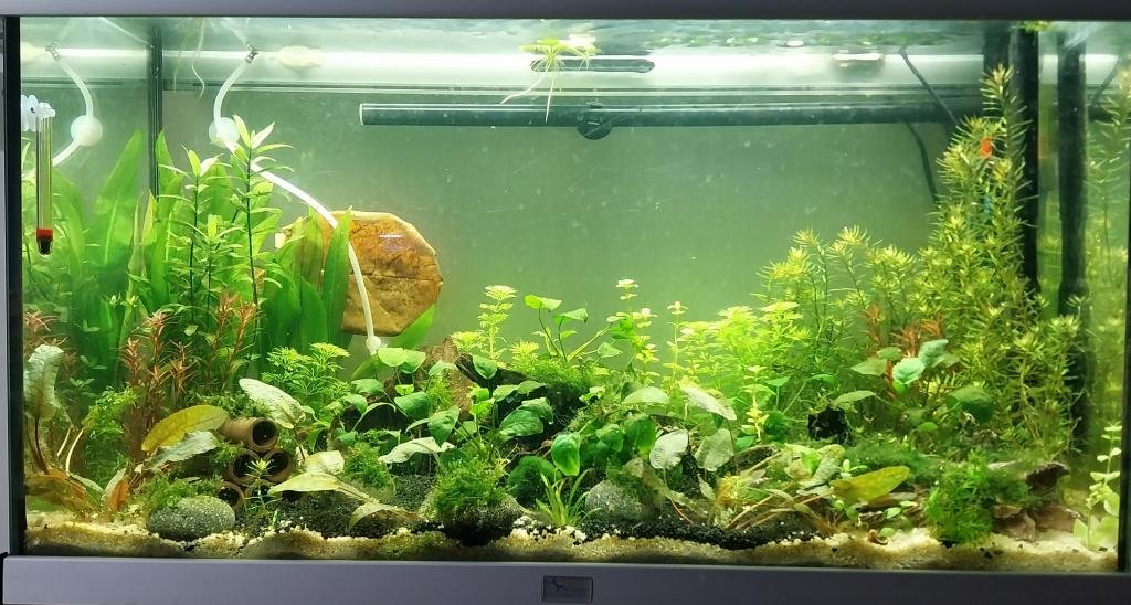 Aquarium mis en eau le 31 aout 2025. Avec : - filtre interne 1000l/h marque inwa pur1000 - 2 rampes Led rgb prise sur jardiland total 26w - chauffage 200w Pypabl) - Quelques plantes et 3 roches = Rotala Laos/ Cryptocoryne Brown / Egeria Dansa /Hygrophila / Echino Bleherae - Thermometre Plongeant Mise à jour le 20/09/2025 : - Changement filtre interne par un filtre externe Eheim pro 4+ avec canne d aspiration et la canne de rejet couvrant toute la largeur du bac (vient taper sur la vitre face) - Changement Led avec une barre Led JBL solar Natur 37W + Effect RGB 13W - ajouts de rotala Red Blood - limnobium - 2 racines + Anubias - Mousse de java sur racines et roches Mise à jour du 04/10/2025 - installation d un kit co2 (bouteille soda stream + adaptateur + 1 nicrew. Réglé 1 bulle/seconde. Bientot un dropchecker à Co2 arrive Voila voila |