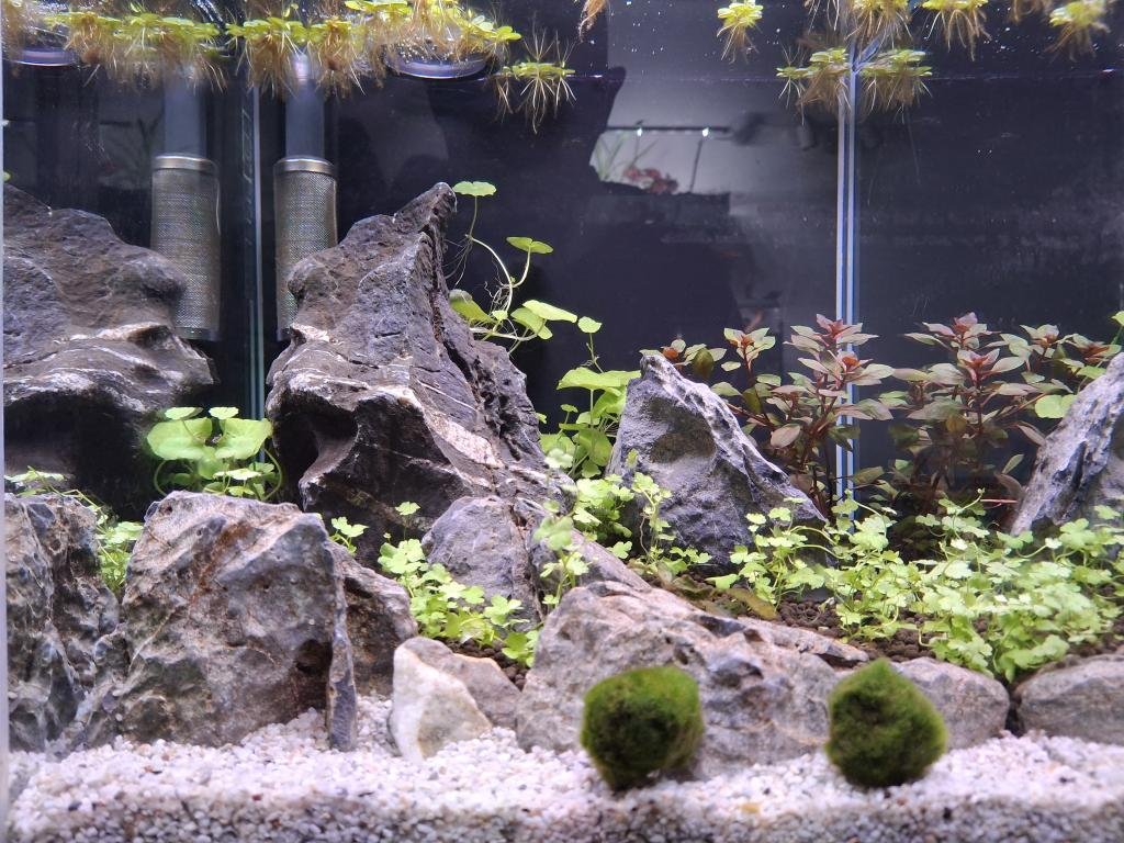 Bac planté, plantes flottantes. Sol technique. Décor Seryu stone et sable de Loire gris. Filtre cascade et éclairage LED, non chauffé.