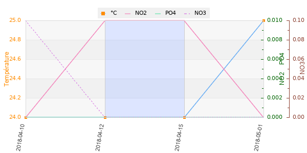 | Température | pH | Dureté_carbonatée(KH) | Dureté_totale(GH) | Nitrites(NO2) |