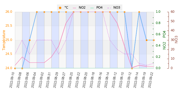| Température | pH | Dureté_carbonatée(KH) | Dureté_totale(GH) | Nitrites(NO2) | Nitrates(NO3) |