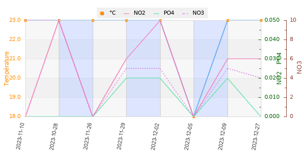 | Température | pH | Dureté_carbonatée(KH) | Dureté_totale(GH) | Nitrites(NO2) | Nitrates(NO3) | CO2 | O2 | Fer(Fe) | Phosphates(PO4) |