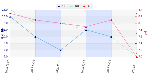 | 26 °C | 8,3 | 14 | 13 | 0,3 mg/l | 1 mg/l | 2 mg/l | 662 µS/cm |