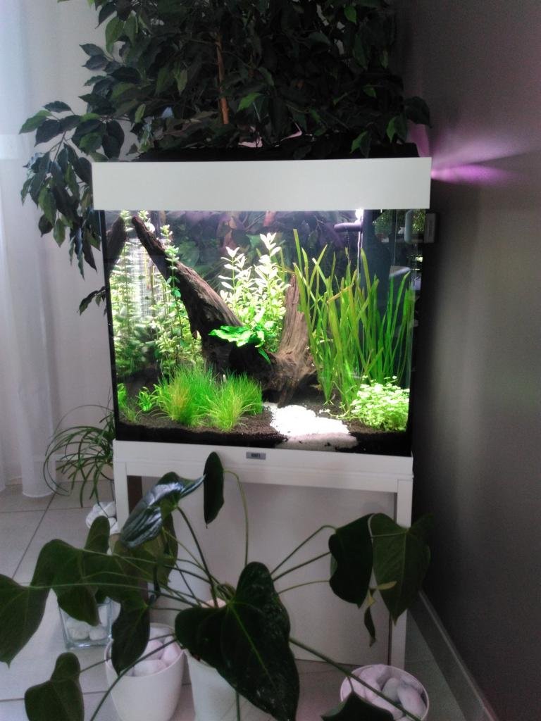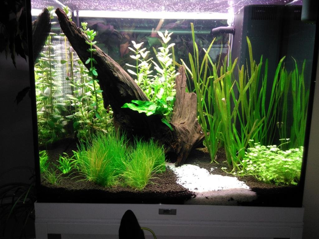 rajout d'une rampe Aqualight 2x24w, donc 96 w pour 100 l d'eau. Supprimé du filtre la mousse au charbon et la mousse nitrax remplacés par une bonne dose de "nouilles" pour support bactérien et ouate de perlon. cordon chauffant 10w au sol (+ le thermoplongeur 100 w). Temp : 25°. |